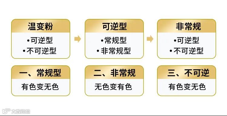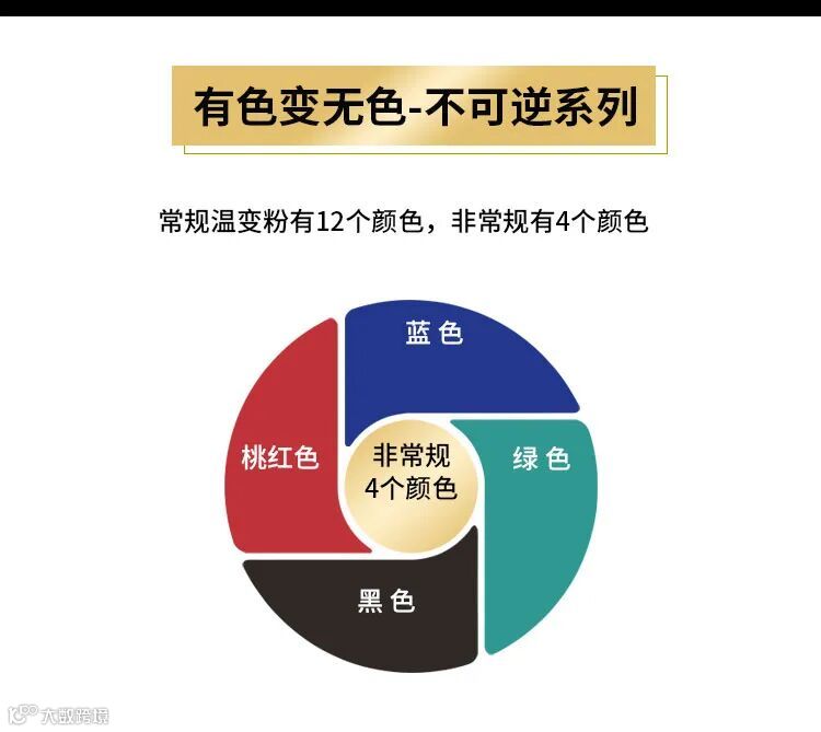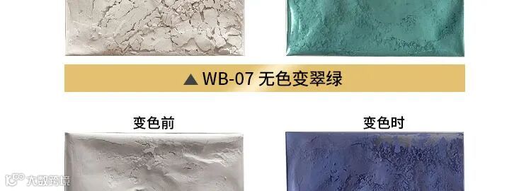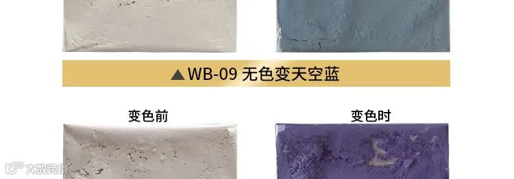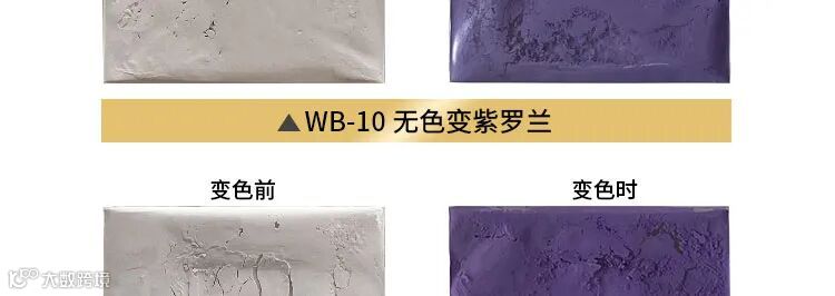 辉彩温变粉是由电子转移型有机化合物体系制备的。这种变色物质不仅颜色鲜艳,而且可以实现从“有色===无色”状态的颜色变化,这是重金属复盐络合物型和液晶型可逆感温变色物质所不具备的。