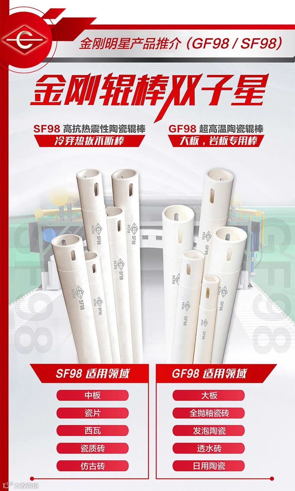 优质的辊棒能为窑炉传动烧制过程提供有力的保障,使窑炉走砖整齐、出砖效果好、优等品率高。此次,金绿能、博德都选用了金刚的GF98、GF96辊棒。金刚GF超高温辊棒系列采用国际先进的耐磨和耐火材料为主要原料,使用自主发明专利冷等静压成型技术,集高强度以及卓越的抗高温蠕变性能于一身,其抗弯能力及抗变形能力强、弹性模量及加工精度高,在高温下不容易变形,走砖平稳,为产品的平整提供有力的保障,生产出来的产品平整度高、优等品率高,满足了金绿能、博德生产的高标准、严要求。