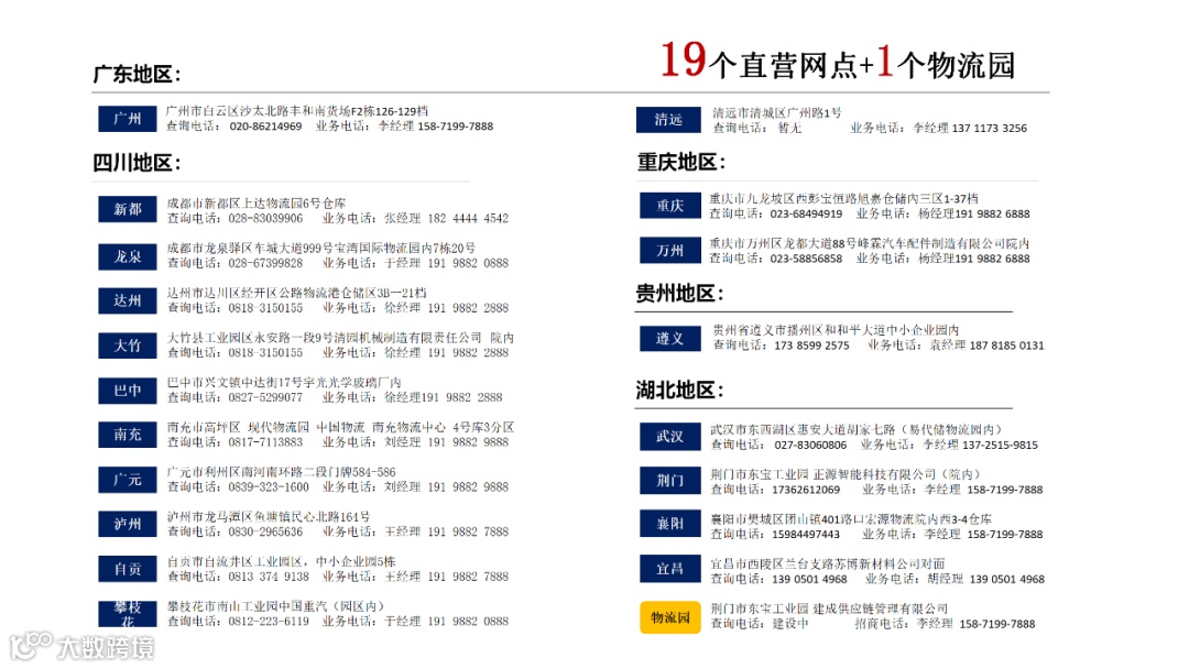 经过长期的筹备,汇通新增4个营业部网点:重庆地区-万州营业部;贵州地区:遵义营业部;湖北地区:宜昌营业部、襄阳营业部。截止目前为止汇通运输相继在“粤、川、渝、鄂、贵”地区开设19个全自营网点+1个物流园的网点战略布局。