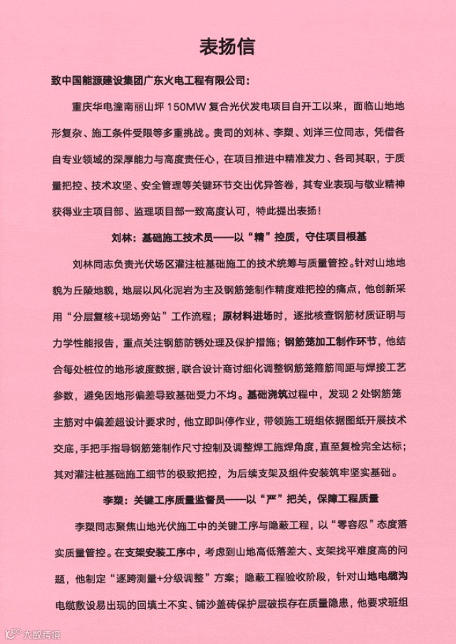 质量月期间,新能源公司重庆丽山坪项目的刘林、李槊、刘洋三位同志凭借专业能力和敬业精神,在复杂山地条件下保障项目高质量推进,获业主公开表扬。