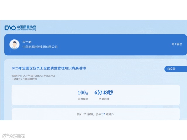 以“以赛促学”激发全员参与热情,积极组织参加“2025年中央企业全面质量管理知识竞赛”,有效强化员工对质量标准、法律法规的理解与执行。