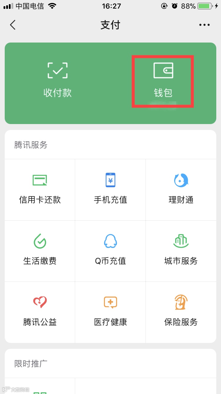 第二步:进入支付菜单主界面后,选择“钱包”功能。