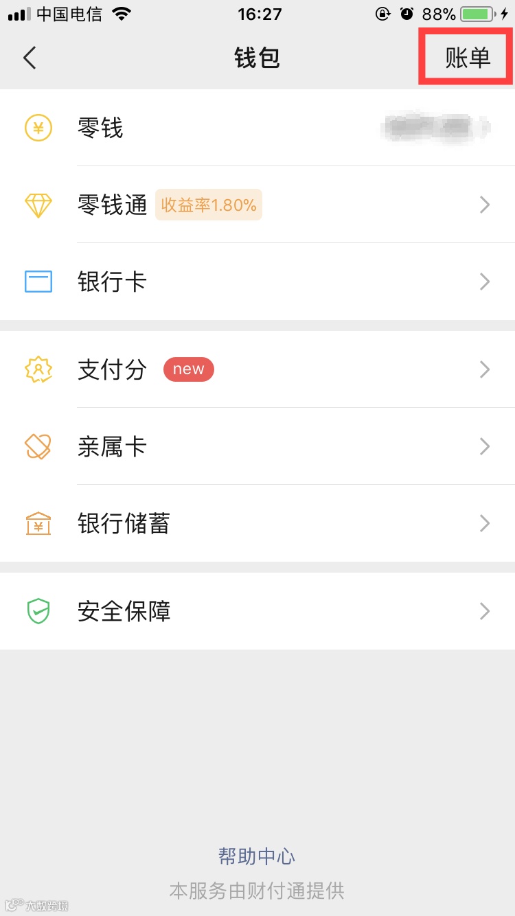 第三步:在钱包功能界面,选择顶部的“账单”功能。