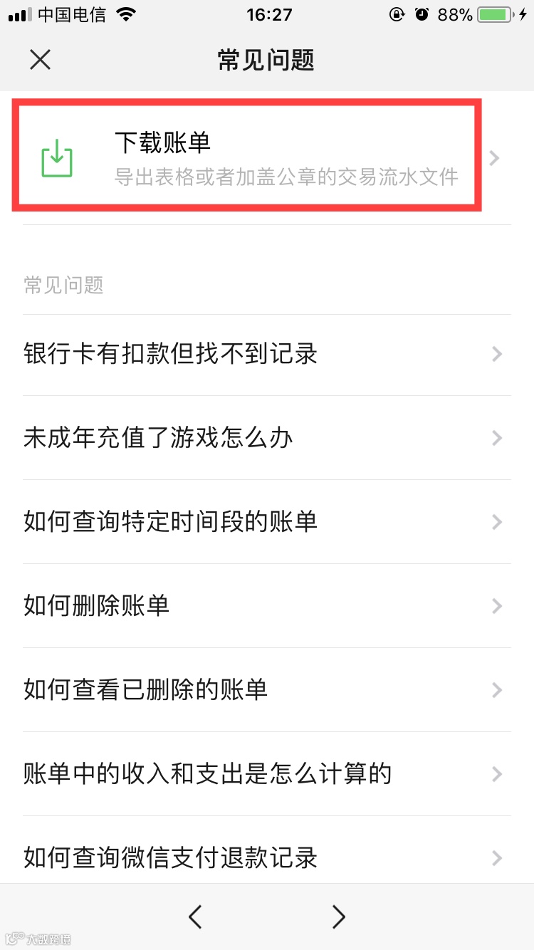 第四步:在账单功能界面,点击顶部的“常见问题”按钮,该界面出现“下载账单”功能,点击该功能,进入账单下载界面。
