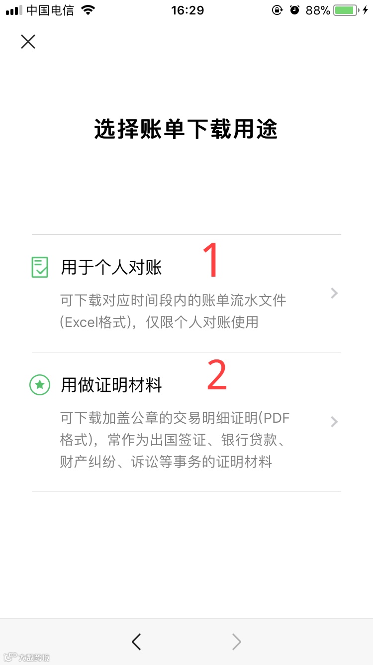第五步:在账单下载界面,有“用于个人对账”和“用做证明材料”两个用途选 项,其中第一个是Excel格式,第二个是PDF格式。