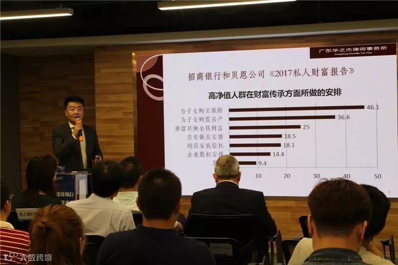 接下来由广东华之杰律师事务所高级合伙人李朔律师带来了他的议题:现今中国的财富传承。李朔律师首先对现今国内高净值人士的存在状况及财富传承状况做以分析,然后通过图表及案例讲述了财富传承的工具运用,令现场嘉宾们加深了对财富传承的理念和方法的认识。