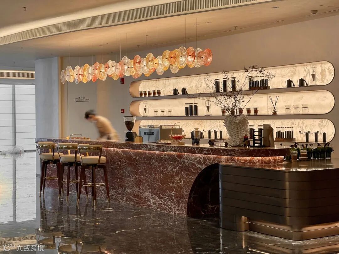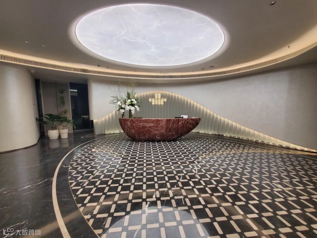 生活美学馆中有一块玛瑙红石材服务台,因整块石材体积过大,需作三段式切割,在工厂经过多轮试拼方案后,运输至现场完成拼装,并在拼缝处以同色云石胶修饰;同时为了与现场圆顶、弧形背景墙完美融合,服务台采用双曲面造型,项目团队采取人工开凿、打磨、抛光,历时20天,这块悉心雕琢的服务台顺利落成。