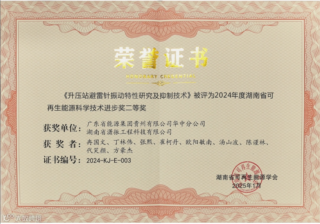 近日,湖南省可再生能源学会2024年度科技进步奖评审会在湖南长沙顺利召开,华中分公司牵头的科技项目《升压站避雷针振动特性研究及抑制技术》在众多参评项目中荣获2024年度湖南省可再生能源科学技术进步奖二等奖。