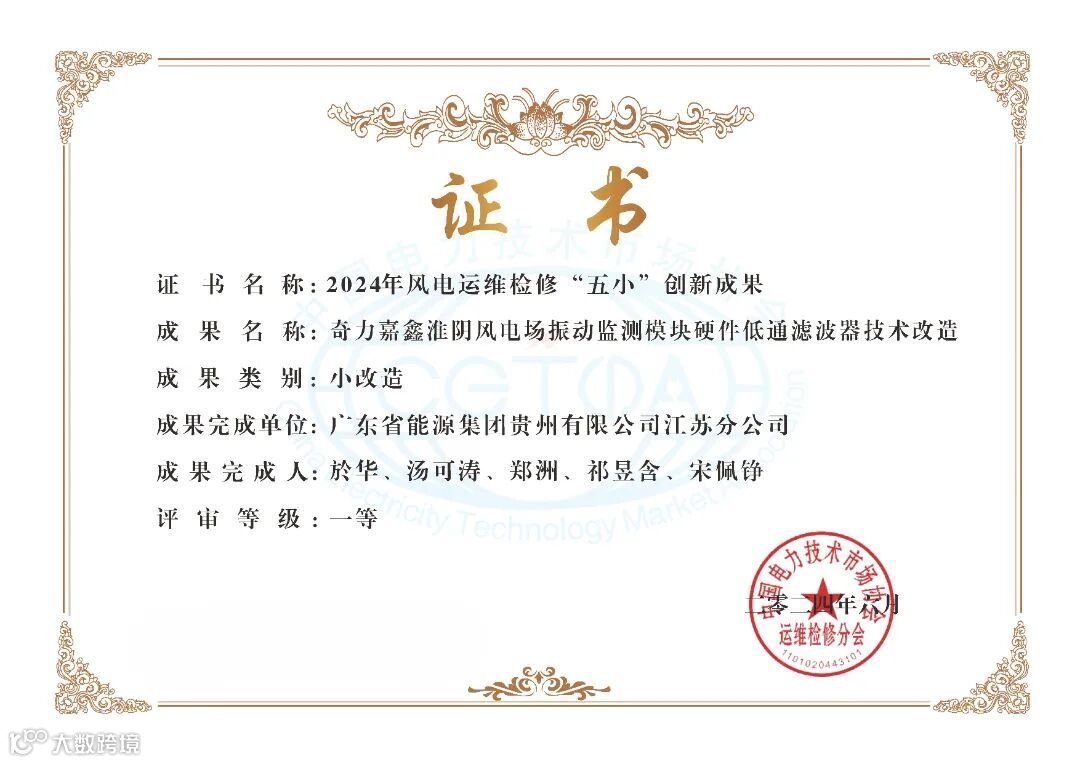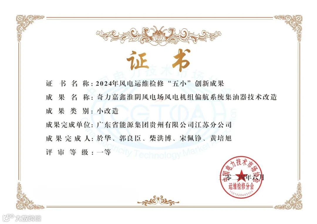 近日,2024年风电场运维检修“五小”创新成果现场发表交流会在湖北孝感召开。本次会议由中国电力技术市场协会主办,全国各大能源企业积极参加,共计产生五小创新成果971项。江苏分公司申报两项目《奇力嘉鑫淮阴风电机组振动监测模块低通滤波器技术改造》《奇力嘉鑫淮阴风电机组偏航系统集油器技术改造》均荣获创新成果一等奖。