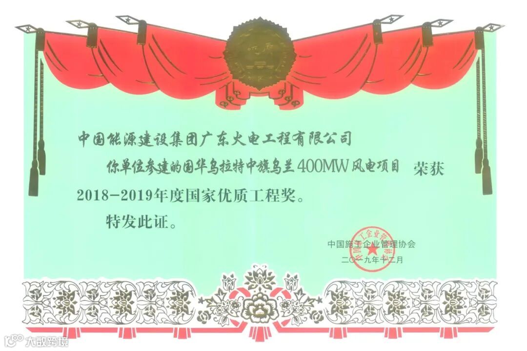 2019年5月,国华巴彦淖尔(乌拉特中旗)风电有限公司乌兰400兆瓦项目荣获“2019年度中国电力优质工程”奖项,同年12月荣获2018-2019年度第二批“国家优质工程奖”。