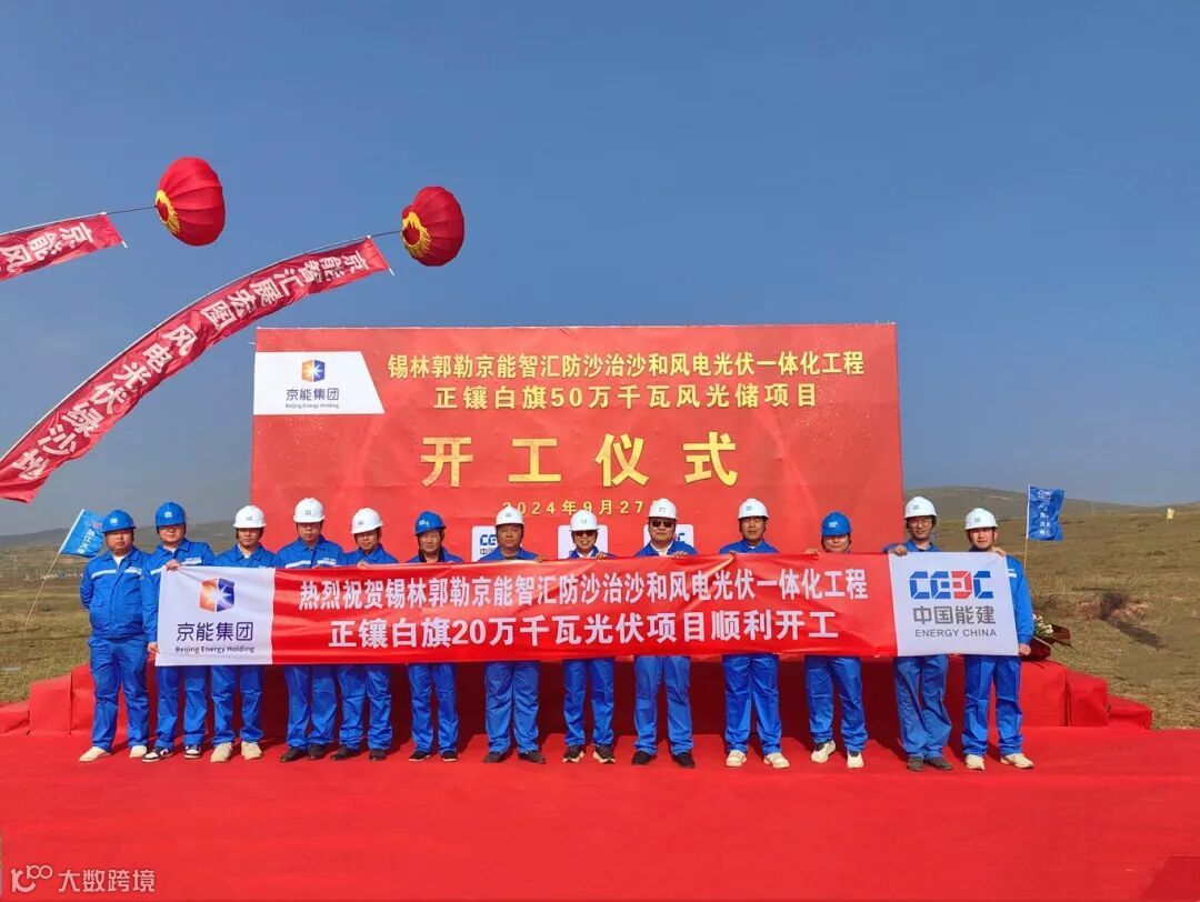 9月,承接的国家第一批防沙治沙和风电光伏一体化工程开工——锡林郭勒京能智汇200MW防沙治沙和风电光伏一体化工程。