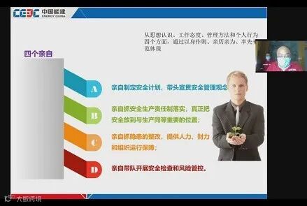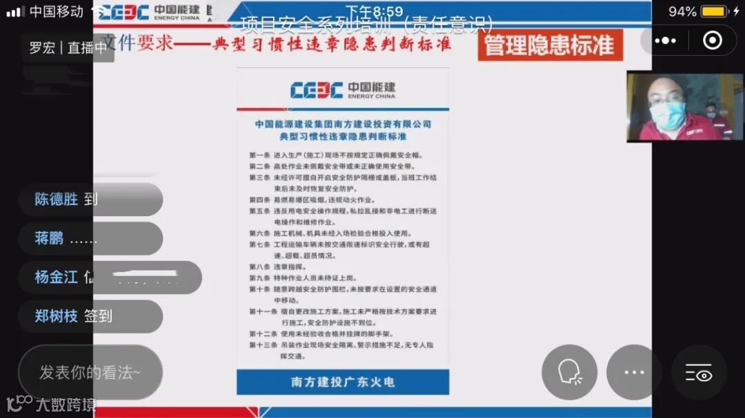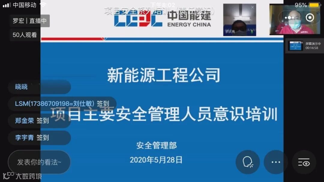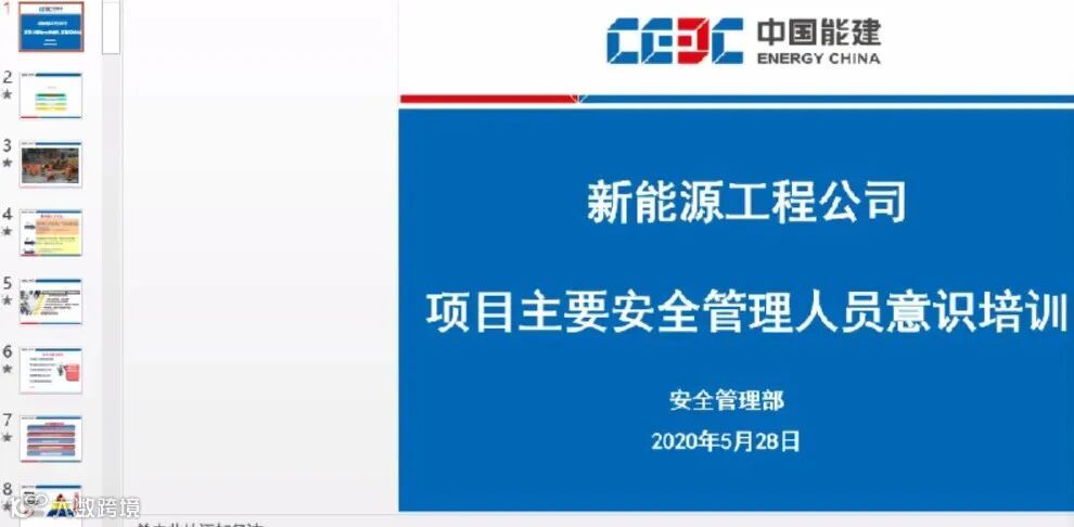 为进一步提高项目负责人及安全管理人员安全技能水平,加强项目人员安全责任意识,掌握本岗位安全操作技能,提升现场安全管理,新能源工程公司于5月28日通过线上企业微信直播开展了项目安全责任意识培训,由安全管理部组织授课,各项目负责人、安全管理人员共66人参加培训。