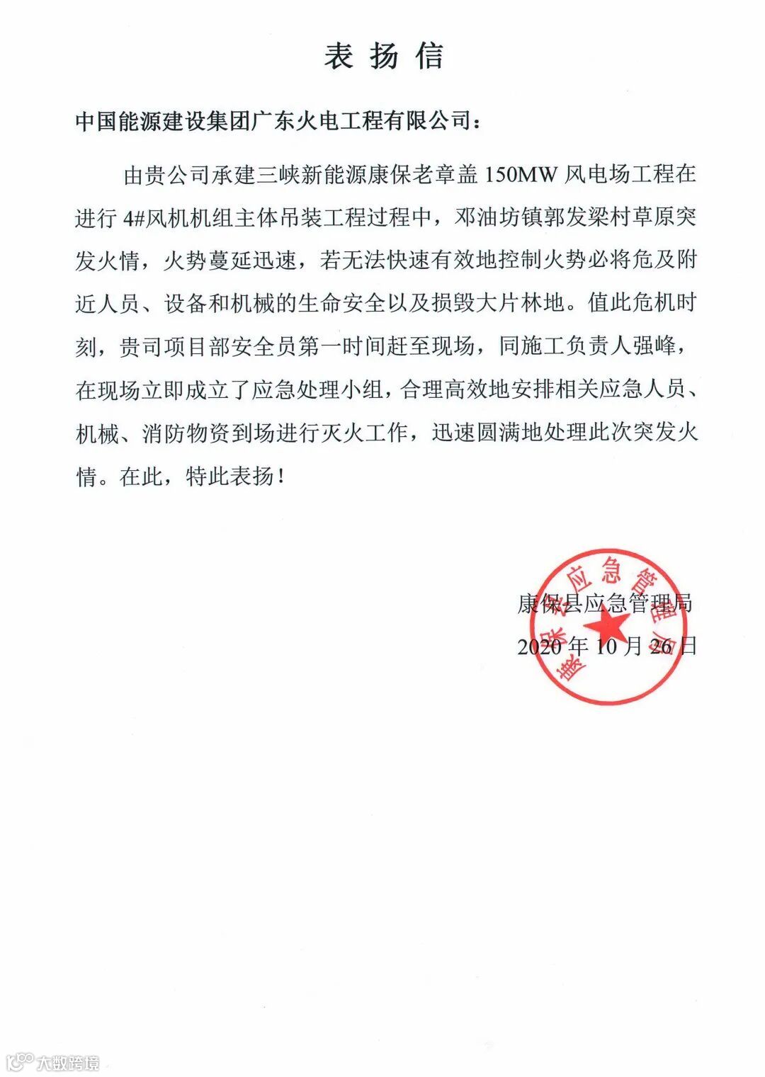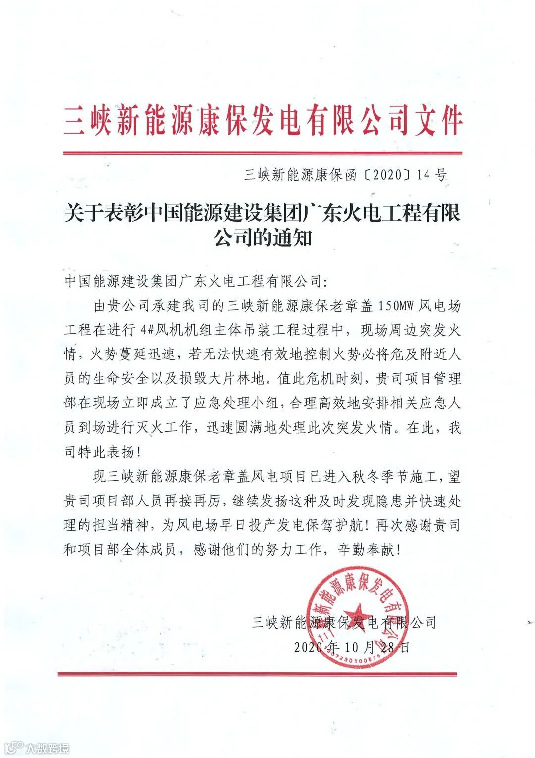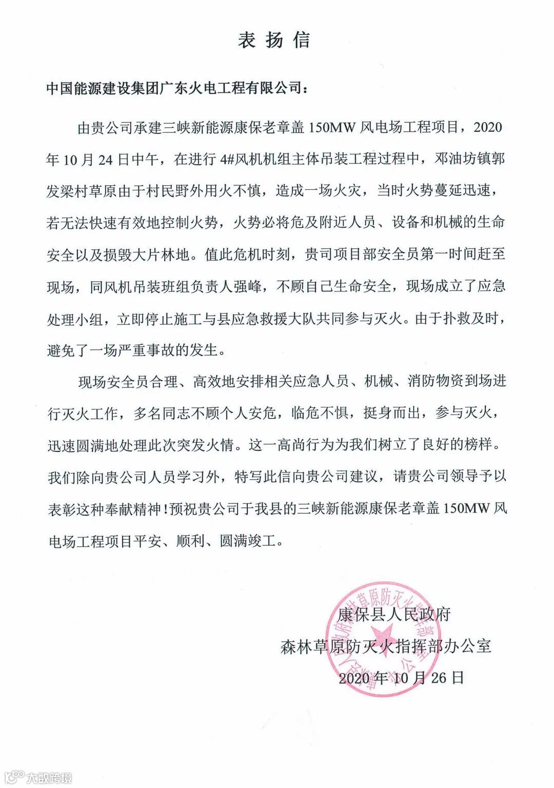 10月26日、28日,中国能建南方建投广东火电相继收到康保县人民政府森林草原防灭火指挥部办公室、康保县应急管理局和三峡新能源康保发电有限公司共三份表扬信,对广东火电员工在三峡新能源康保老章盖150兆瓦风电场项目现场周边发现突发火情并积极参与灭火工作的英勇表现予以表扬。