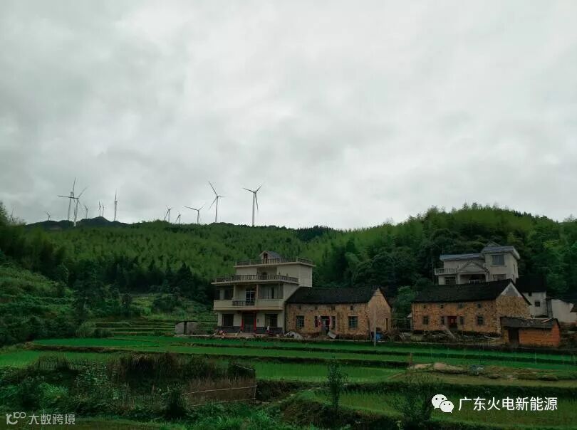 雨后风机群下静谧的小村庄