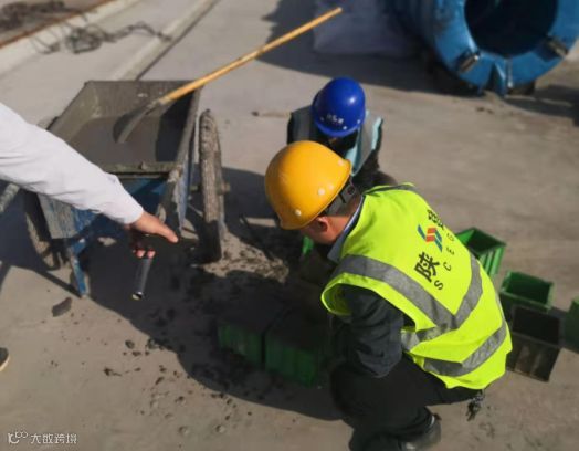 试验主任吴程成检查混凝土的和易性,制作抗压试块,把控混凝土质量的每一个细节,确保工程质量。
