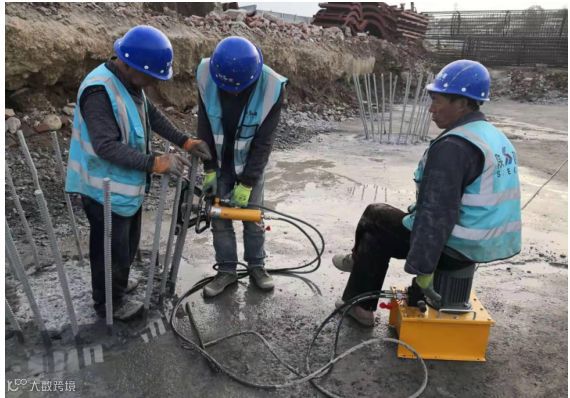 桥梁班组的王师傅和他的工友,用液压钳正在调直新安康大道冉家河中桥的桩头钢筋,完成最后几根钢筋调直工作,为桩基分部工程验收做好准备。