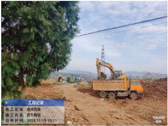 忙碌的土方施工机械,在冉河西路转运弃土,为雨水管道开挖清理工作面。
