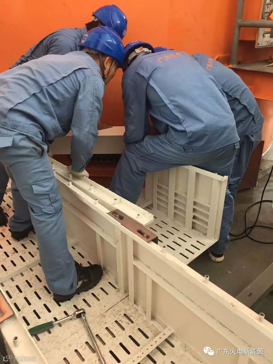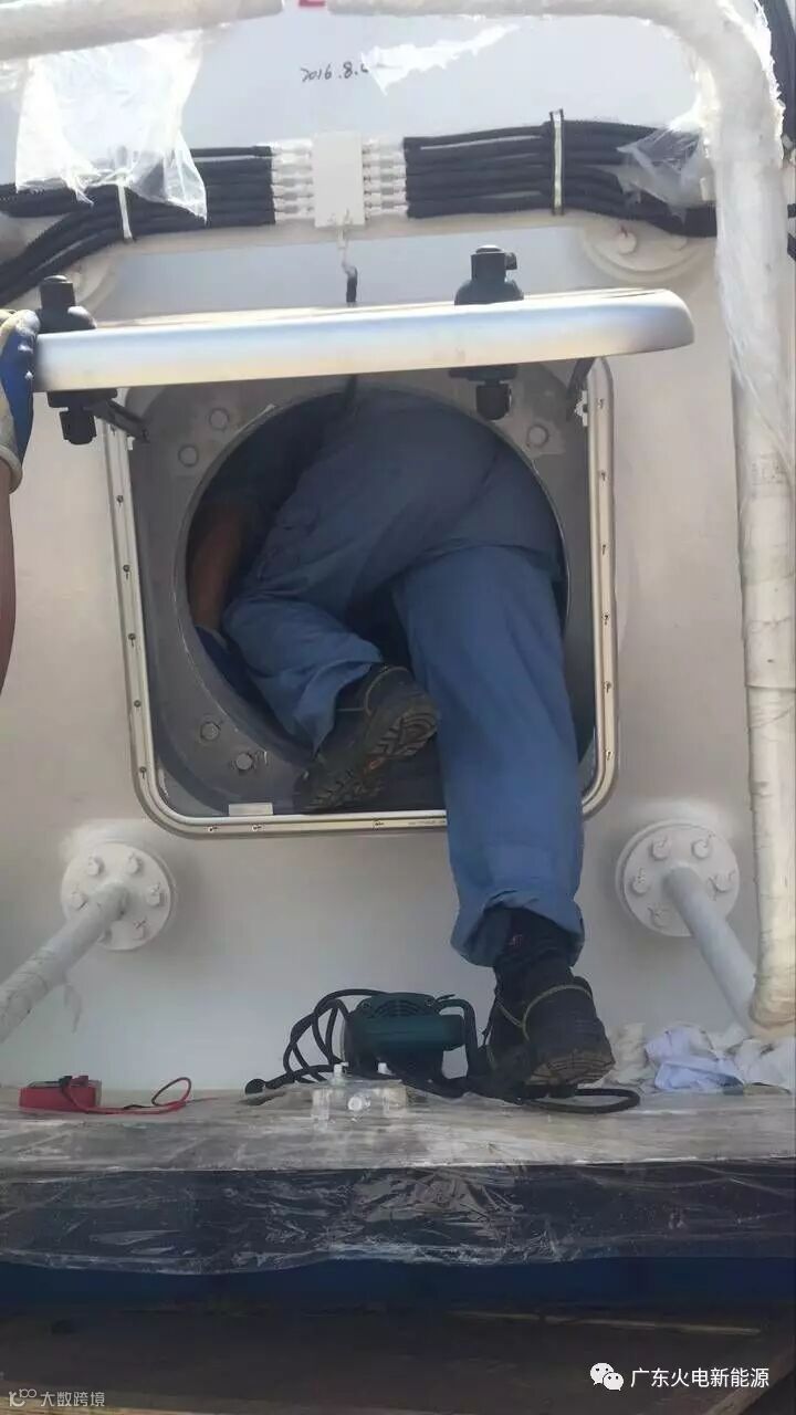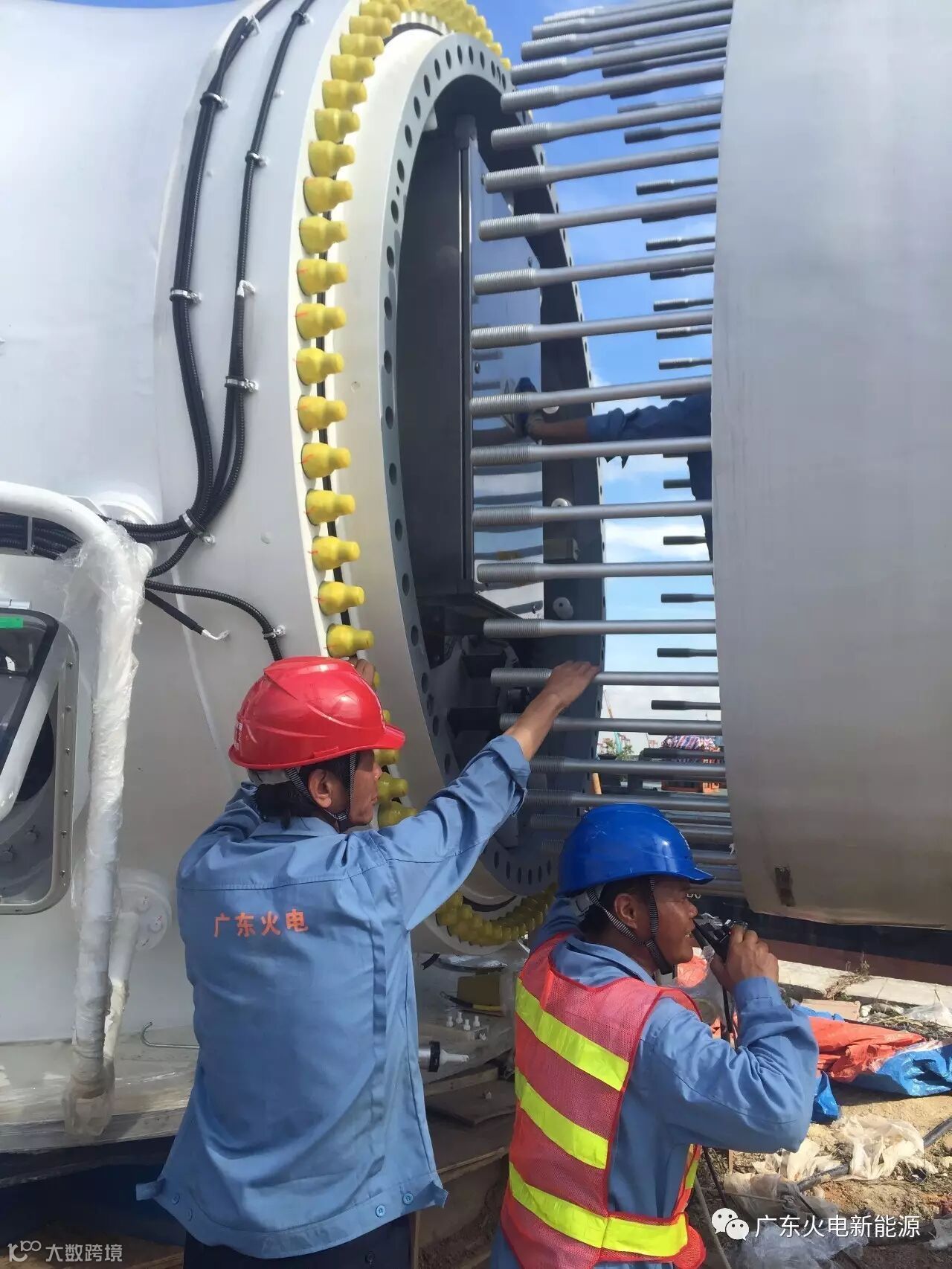 珠江边、临海工业园,长长的白色塔筒随着吊臂的回转,缓缓地站立在驳船上。塔筒外,烈日当头;塔筒内,仿佛烤炉的中心,窒息的气息缭绕。一群蓝色的身影出现在顶节塔筒的内部,汗水侵浸着睫毛,目光却从未离开手中的动力电缆。密封、空气循环差且温度接近40度的塔筒内,对讲机传来了清晰而有力的声音: