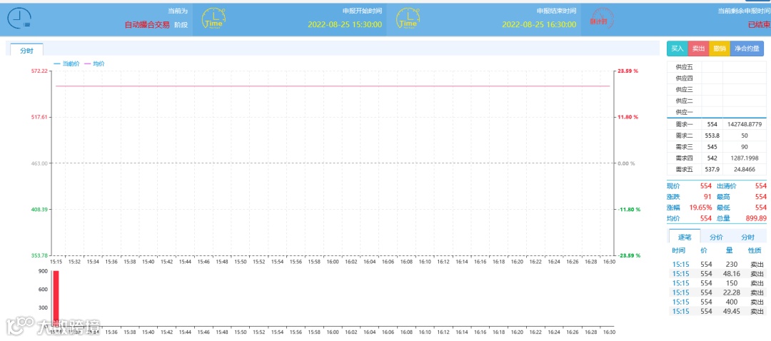 集中竞价阶段出清价为554厘/千瓦时,滚动撮合阶段未有成交,最终总成交电量0.09亿千瓦时,成交均价554厘/千瓦时,环比持平。本月月竞交易中,需求方以顶价申报的电量共14.3亿千瓦时未成交。