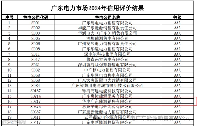 9月19日,广东电力交易中心公布广东电力市场2024年信用评价结果,华电广东能源销售有限公司荣获AAA最高级评级,充分体现了公司的综合实力和卓越的市场信誉,为持续开发零售市场,提升价值创造能力,巩固华电品牌形象奠定了良好的基础。