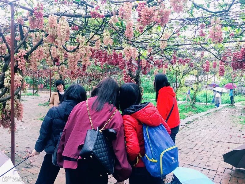看山看水看美景,赏花赏雨赏美人”在爬完山后,我们又来到了禾雀花基地。禾雀花四季常青,连不断,每串二三十朵,由一绿色小藤串连,酷似千万只禾雀栖息于林中浓荫下,吊挂成串犹,粉白色的、紫色的。。。各类禾雀花争相盛开,赶赴一场春天的 “约会”。