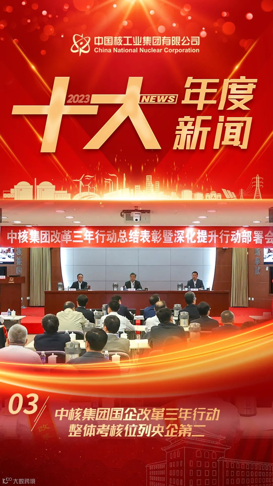 2023年6月21日,国务院国资委公布中央企业国企改革三年行动整体考核结果,中核集团在中央企业排名第二,12项考核任务中,“两非”剥离、“压减”工作、董事会配齐建强、责任追究体系等4项任务斩获第一、10项任务位列前十,为三年行动高质量收官画上圆满句号。同年,中核集团新一轮改革深化提升行动全面启动。