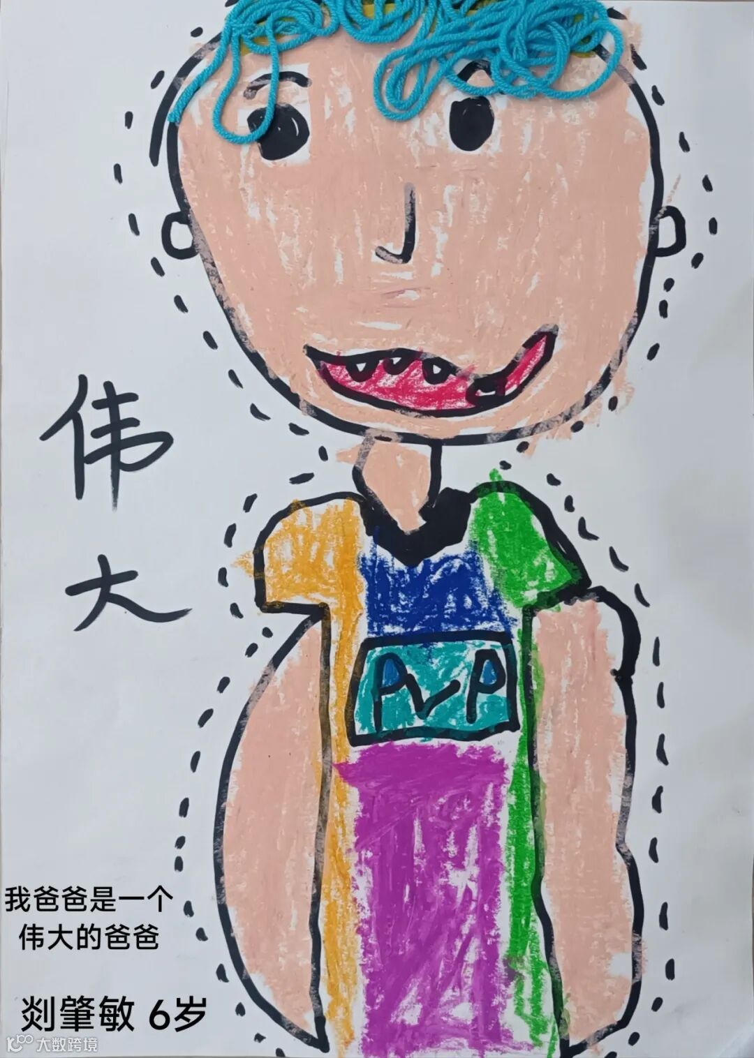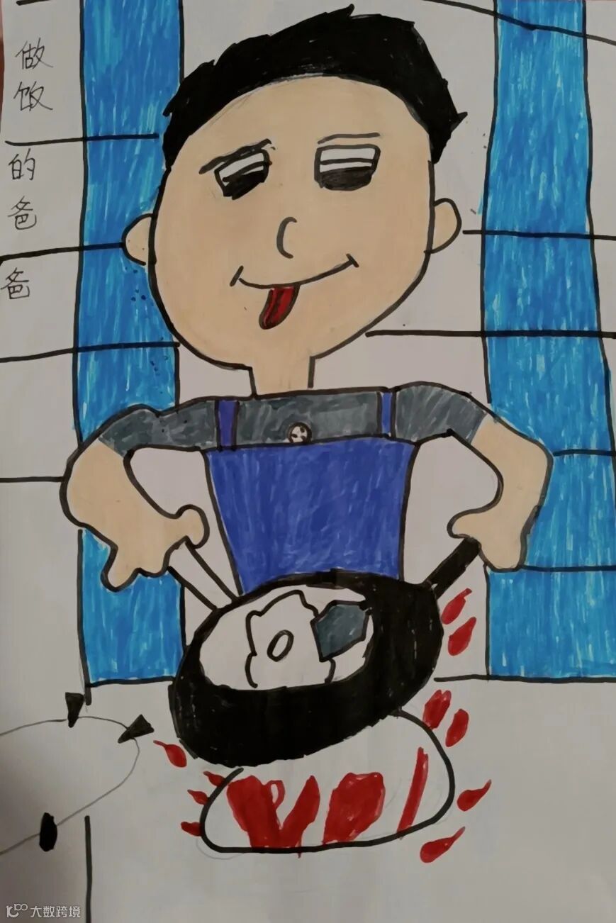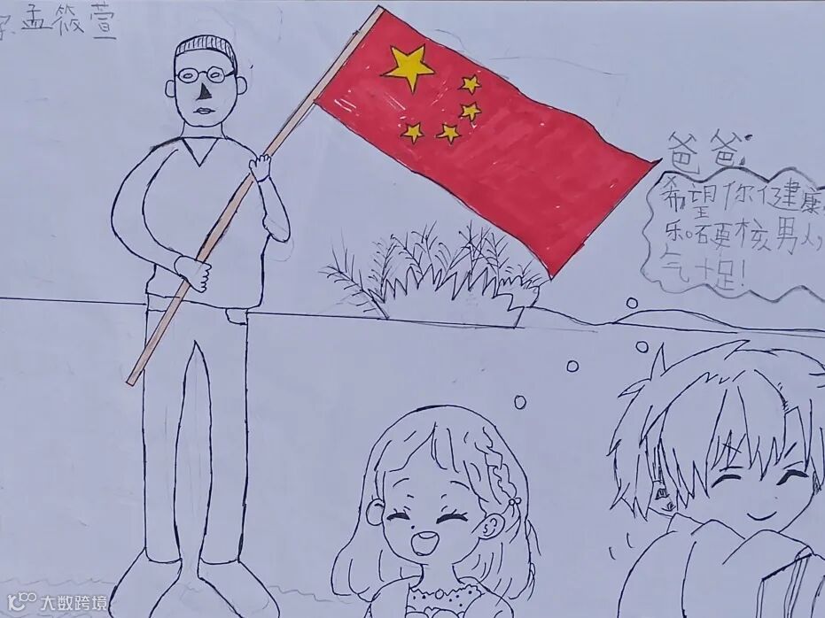 【右一】陈凤兴之子:爸爸经常做鬼脸,逗我们开心,哈哈,这次被我画下来了,祝爸爸天天开心。