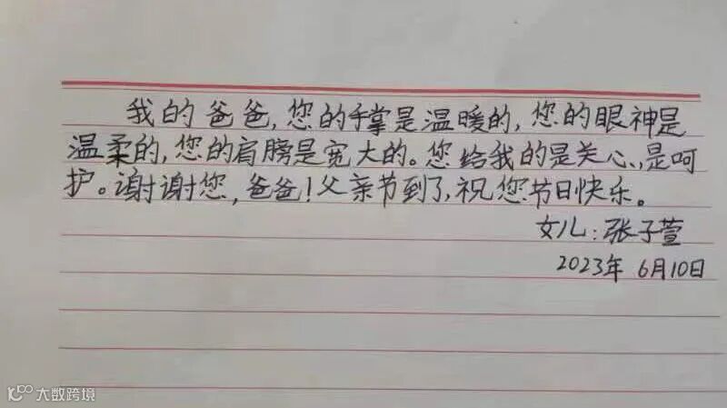 “爸爸是您让我拥有更广阔的天空,是您让我看得更高更远,爸爸您是我心目中的超级英雄。”---王海涛之子