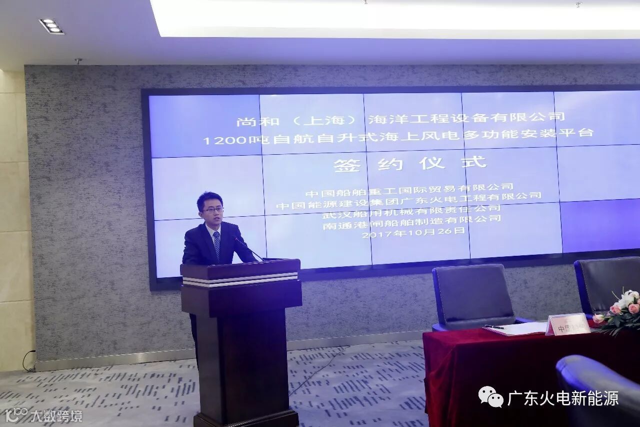 2017年10月26日,尚和(上海)海洋工程设备有限公司“1200吨自航自升式海上风电多功能安装平台”建造项目总包合同、船体分包合同暨与中国能源建设集团广东火电工程有限公司(简称:中国能建广东火电)战略合作协议在武汉船机举行签约仪式。
