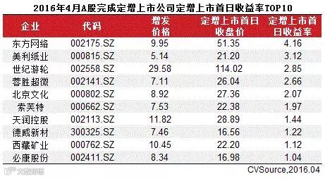 表3 2016年4月A股完成定增上市公司定增上市首日收益率TOP10