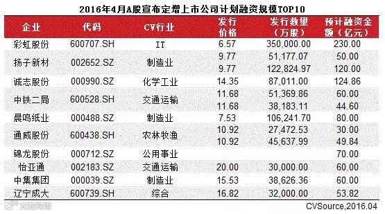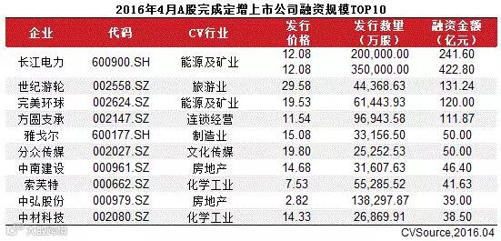 表2 2016年4月A股完成定增上市公司融资规模TOP10