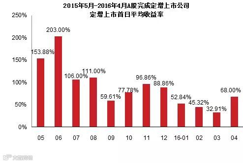 图2 2015年5月至2016年4月A股完成定增上市公司定增上市首日平均收益率