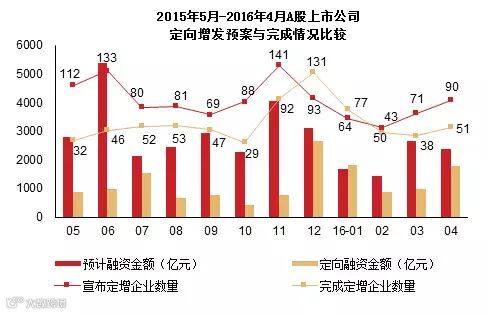 图1 2015年5月至2016年4月A股上市公司定向增发预案与完成情况比较