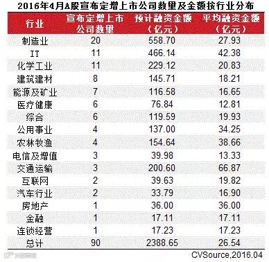 表4 2016年4月A股完成定增上市公司数量及金额按行业分布