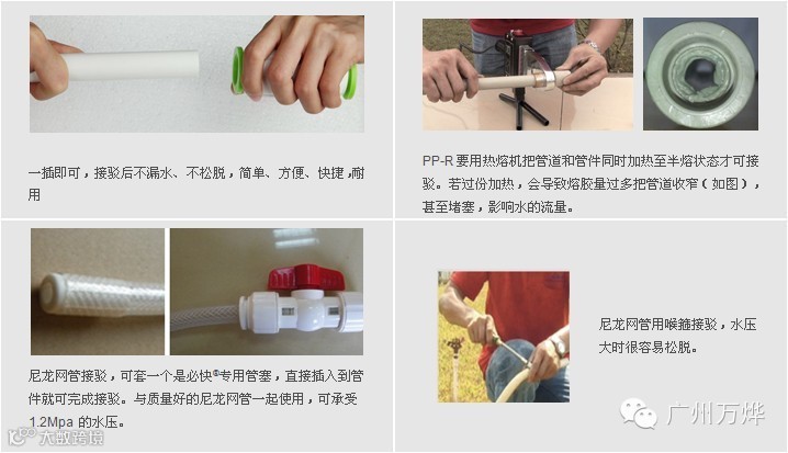 2. 万能接驳功能,可接驳符合国标的所有管道,例如PVC-管、PP-R管、铜管及尼龙网管等。