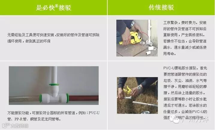 是必快®无需焊接或粘胶水,便可轻松的安装完成,因为不需要工具,在狭小的空间施工,使安装变得更加容易,最重要的是节省安装时间高达40%。