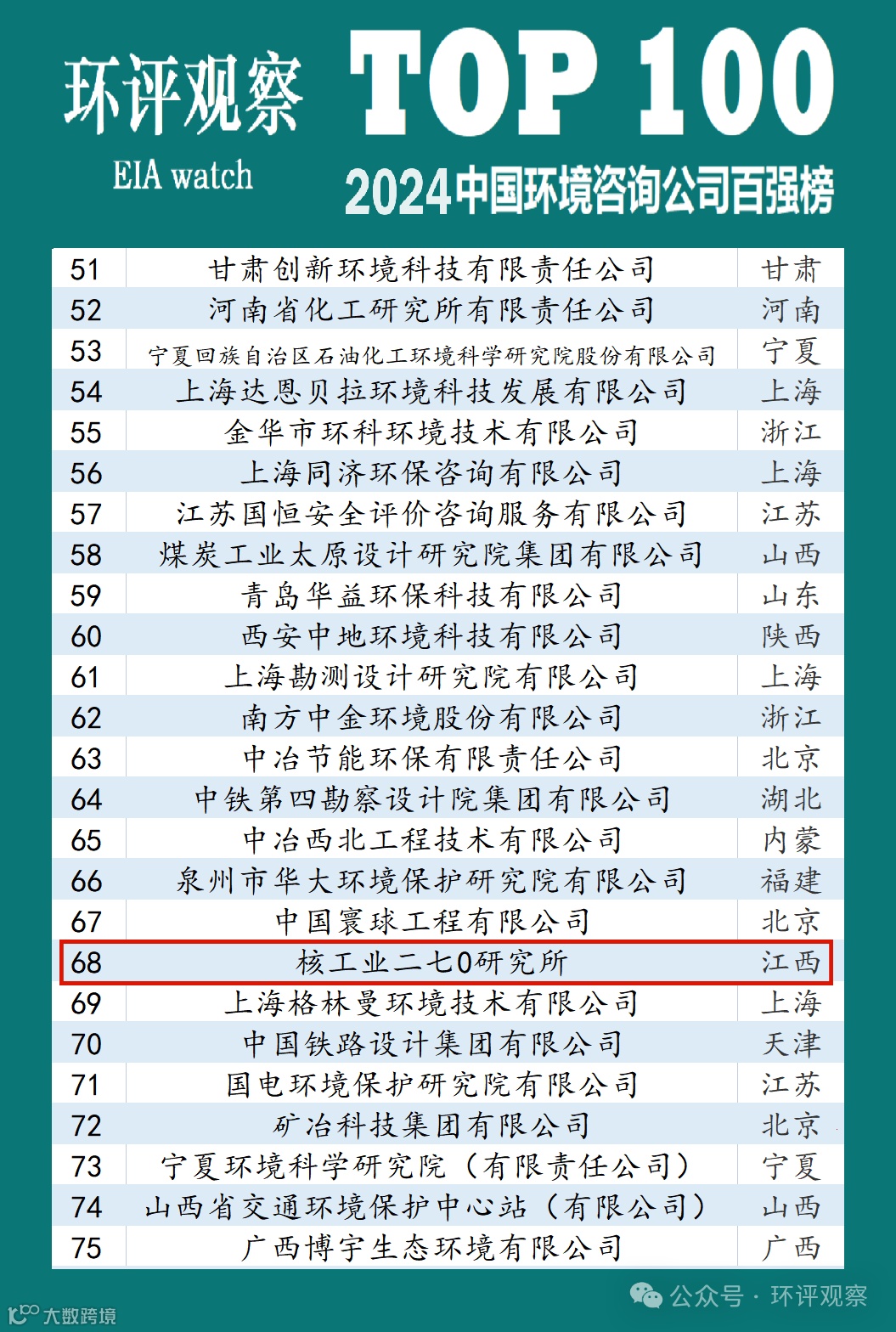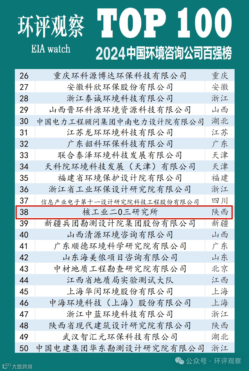 近日,《环评观察》发布了2024中国环境咨询公司百强榜,这是《环评观察》继2020、2021年发布年度环境咨询公司百强榜以来,再次发布环境咨询公司排名榜单。中核西部地勘中心(核工业二〇三研究所)、中核南方地勘中心(核工业二七〇研究所)分别位列2024全国百强环境咨询公司第38位和68位!