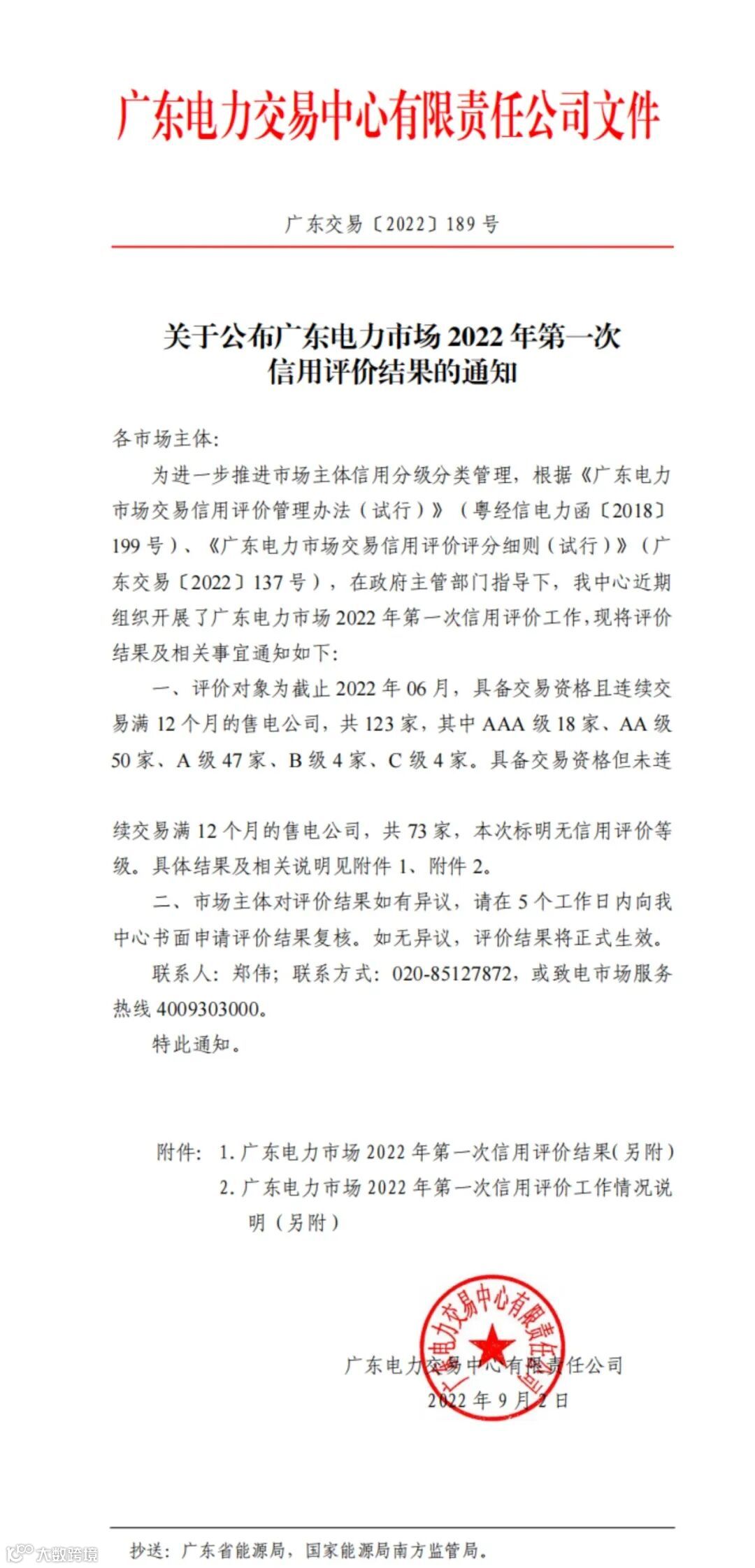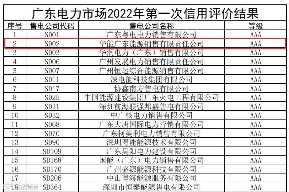 9月5日,广东电力交易中心公布2022年广东电力市场第一次信用评价结果,华能广东能源销售有限责任公司获得最高等级AAA信用评价,充分证明华能广东能销公司综合实力受到市场的高度认可。