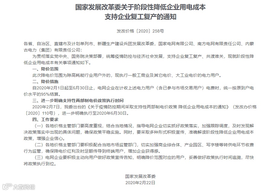 为贯彻落实党中央、国务院决策部署,统筹疫情防控与经济社会发展,支持企业复工复产、共渡难关。国家发展改革委于2月22日发布《国家发展改革委关于阶段性降低企业用电成本支持企业复工复产的通知》(以下简称“通知”)。“通知”要求: