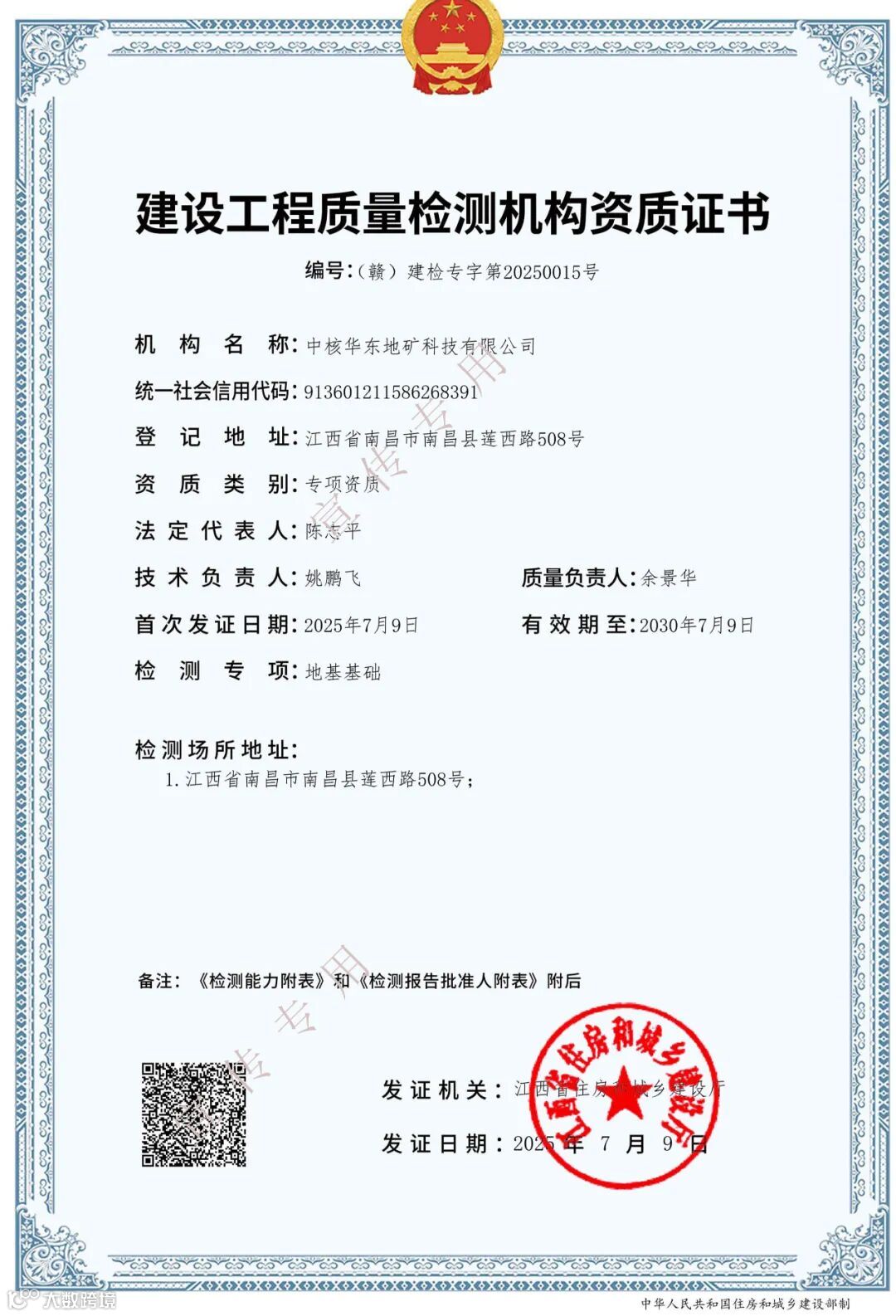 近日,中核南方地勘中心平台公司——中核华东地矿科技有限公司顺利完成建设工程质量检测机构资质证书延续工作,获颁有效期5年的新证书,标志着公司在该领域的专业能力与服务水平再次通过权威认证。