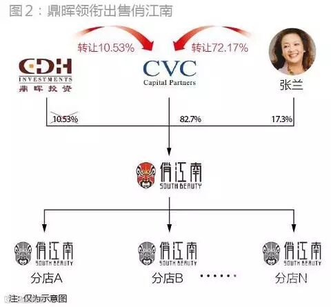 2014年4月,CVC发布公告宣布完成对俏江南的收购。根据媒体的报道,CVC最终以3亿美元的价格收购了俏江南82.7%的股权。由此可以推测,除了鼎晖出售的10.53%,其余超过72%的部分即为张兰所出售(图2)。