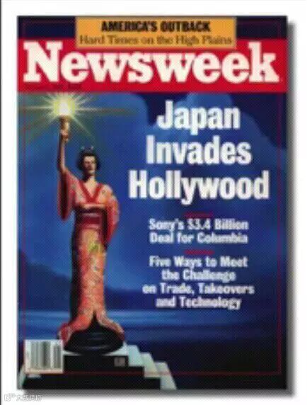 1989年日本人购买美国资产的风潮达到了顶峰。1989年6月,索尼公司宣布,他们以34亿美元的价格成功收购了美国娱乐业巨头,也是美国文化的象征之一——哥伦比亚电影公司。在1989年10月出版的美国《新闻周刊》上自由女神像被披上了和服。