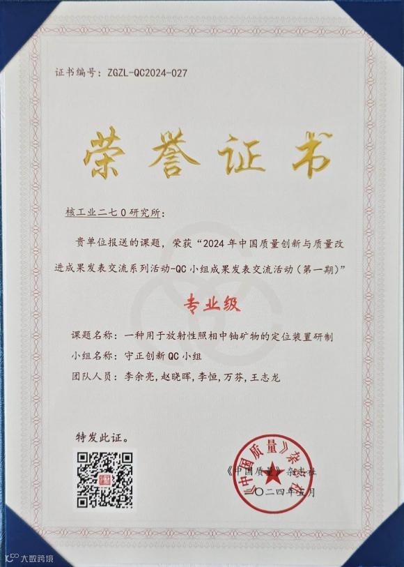 在刚刚结束的全国QC小组成果发表活动中,中核南方地勘中心守正创新QC小组《一种用于放射性照相中铀矿物定位装置研制》课题,荣获专业级奖项。