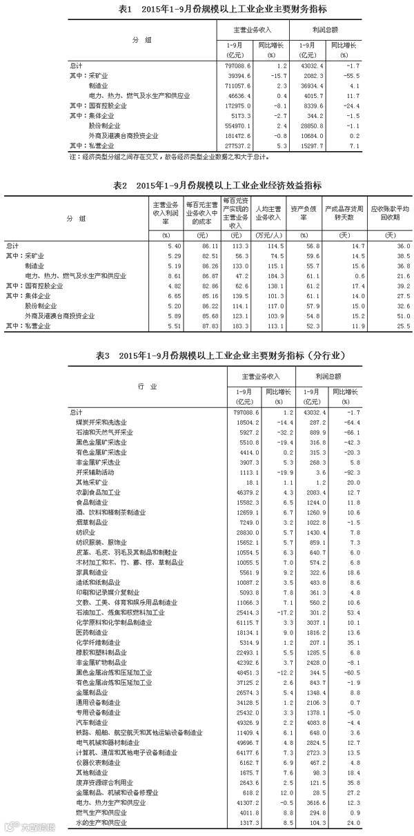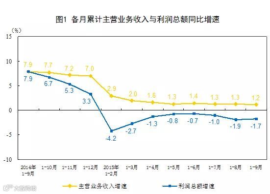 1-9 月份,在 41 个工业大类行业中, 30 个行业利润总额同比增长, 11 个行业下降。主要行业利润增长情况:农副食品加工业利润总额同比增长 12.7% ,纺织业增长 7.8% ,石油加工、炼焦和核燃料加工业增长 53.4% ,化学原料和化学制品制造业增长 10.1% ,通用设备制造业增长 0.7% ,电气机械和器材制造业增长 12.7% ,计算机、通信和其他电子设备制造业增长 13.5% ,电力、热力生产和供应业增长 12.3% ,煤炭开采和洗选业下降 64.4% ,石油和天然气开采业下降 66.1% ,非金属矿物制品业下降 8.1% ,黑色金属冶炼和压延加工业下降 60.5% ,有色金属冶炼和压延加工业下降 1.9% ,专用设备制造业下降 5% ,汽车制造业下降 4.4% 。