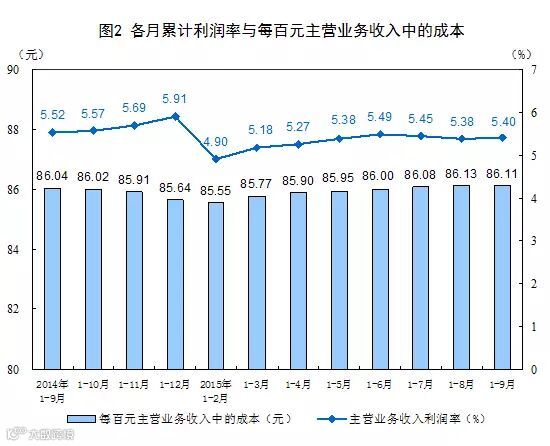 1-9 月份,规模以上工业企业实现主营业务收入 797088.6 亿元,同比增长 1.2% ;发生主营业务成本 686411.2 亿元,增长 1.3% 。