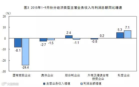 1-9 月份,在规模以上工业企业中,国有控股企业实现利润总额 8339.6 亿元,同比下降 24.4% ;集体企业实现利润总额 344.2 亿元,下降 1.5% ;股份制企业实现利润总额 28850.8 亿元,下降 1.1% ;外商及港澳台商投资企业实现利润总额 10684 亿元,增长 0.2% ;私营企业实现利润总额 15297.7 亿元,增长 7.1% 。