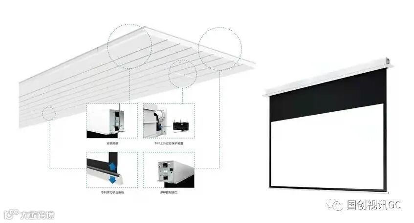 隐藏式设计,幕布回卷后电动门自动闭合与天花装修融为一体;