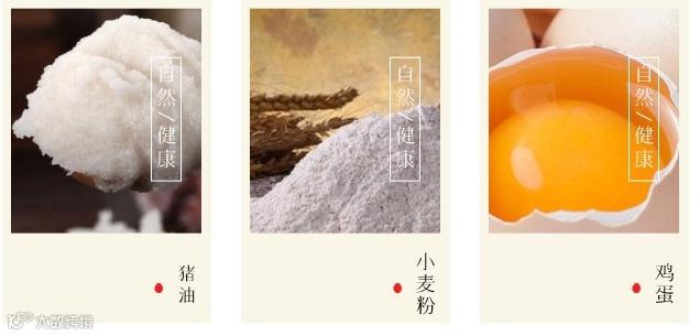 精心挑选的自然健康的食材:猪油、小麦粉、鸡蛋。