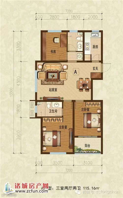 A户型:三室两厅两卫 115.16㎡