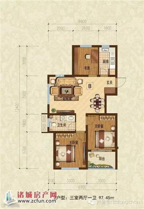 B户型:三室两厅一卫 97.45㎡